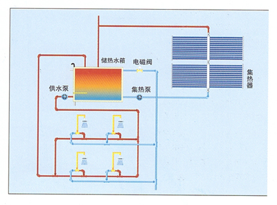 本系統中集熱器集中放置,設置滿足用戶需求容量的大型儲熱水箱,控制系統、循環裝置及其他輔助設...